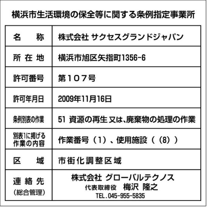 | 所在地 | [本社] 〒231-0004 神奈川県横浜市中区元浜町2-13-1-802 TEL:045-777-3100 FAX:045-955-0816 [旭営業所] 〒241-0803 神奈川県横浜市旭区川井本町70-7 (株)グローバルテクノス内 TEL:045-955-5835 FAX:045-955-5836 [旭リサイクルセンター] 〒241-0811 神奈川県横浜市旭区矢指町1356-6 TEL:045-959-0108 FAX:045-955-0816 |